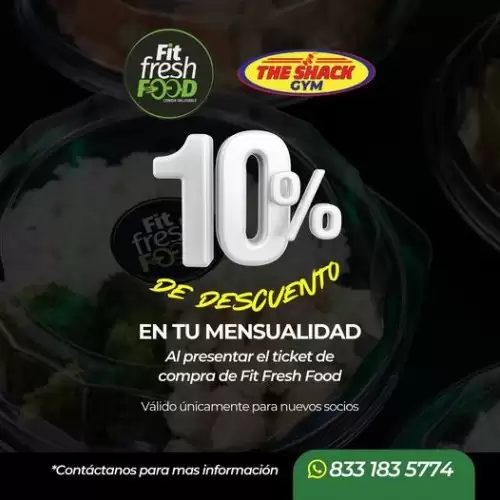 10% DE DESCUENTO EN TU MENSUALIDADAl presentar tu ticket de compra en Fit Fresh Food Fit Fresh Food Tampico (Válido únicamente para socios nuevos)y al presentar tu ticket de The Shack Gym 15% de descuento en platilloso 5% en plan
